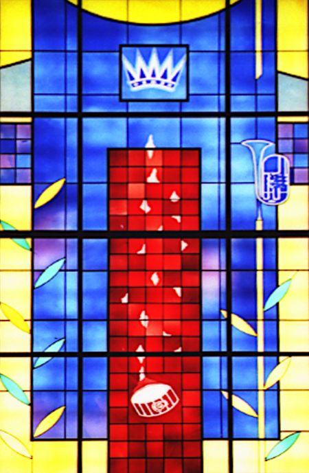 The leaf-like forms that float upwards symbolize the individual within the community and brings to mind Jesus' words: "I am the vine, you are the branches." John 15:5. Extending from the vine is a cornet which calls the  community to worship. The crown and the yellow circle above it look forward to future glory and the light of God "...God is light and in Him is no darkness at all" I John 1:5 while the purple and violet blue subtly delineate the cross. The form of this window attempts to demonstrate the connection of faith and the joy of worship within the community of faith: it is about the world of actions which can reflect the work of the Holy Spirit.